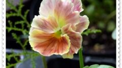 中心付近がアプリコット、外側に向かってピンクになります。中心付近の花弁は短めで、浅いソーサー形の花のようです。