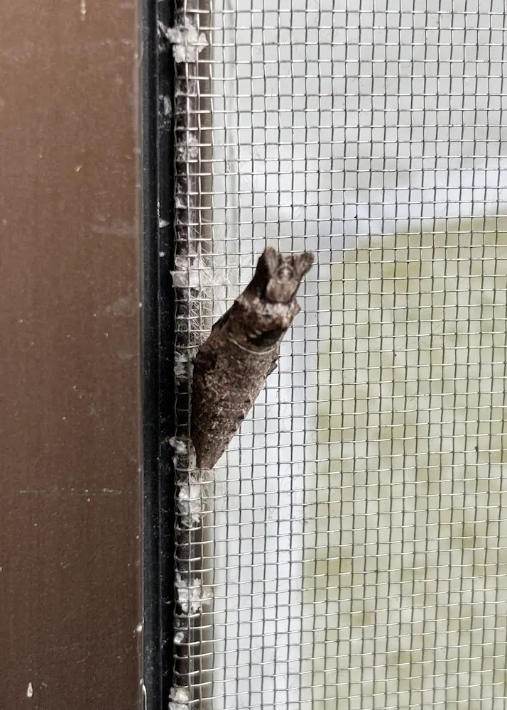 この網戸、2016年の第一回目の冬越し観察記で蛹になっていた窓の垂直上に位置しています。