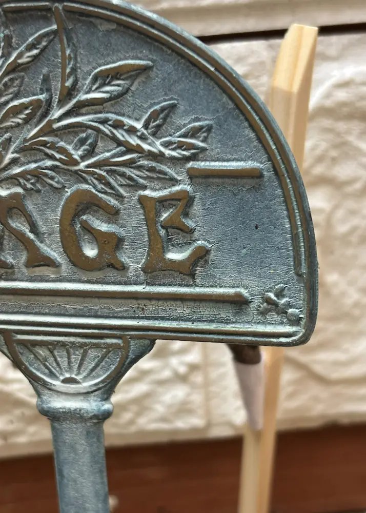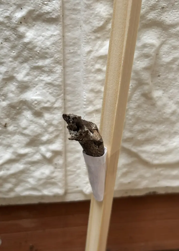 見つけてから一週間ほど、外皮が固まるまでまってから、お引越しさせました。間違えて触ってしまうことがないよう、バリケードとしてセージ印の金属タグを立てました。