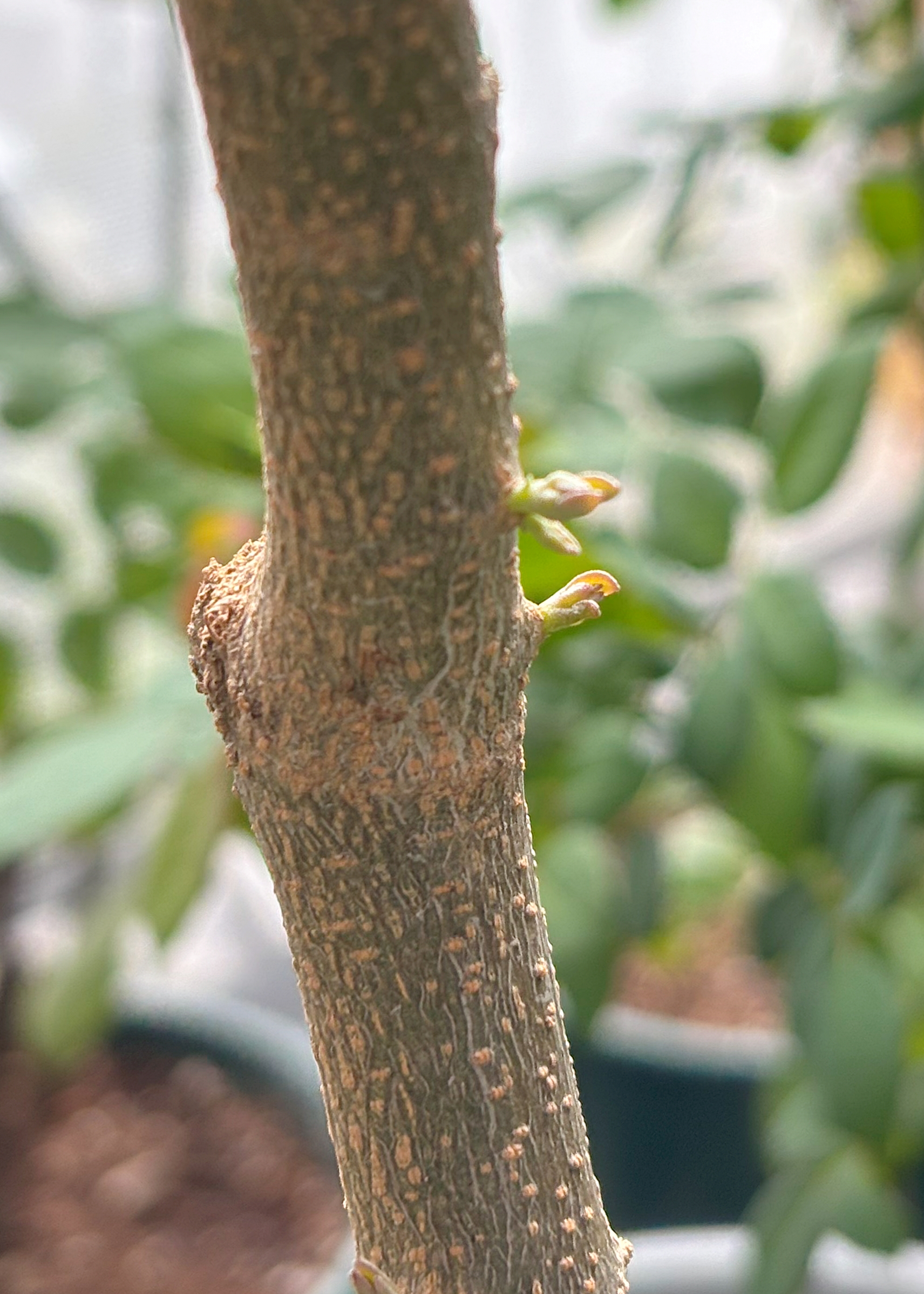 枝は天井に着いて折れ曲がるほど伸び、一本立ちにした幹は少したくましくなったように見えます。