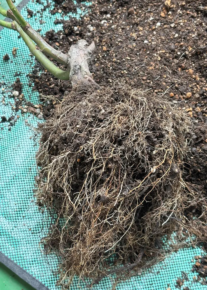 上の画像では、左側が少なめのほう。右側と、こちらからは見えていない裏の方(シートにふれている側)の根は多めです。これが夏に南側を向いていたため直射日光に当たって傷んだからなのか、もともとの性質なのかわかりません(し、気にしていなかった)のですがこういう傾向があります。