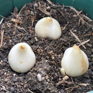 少し水分が抜けて、記憶よりも小さくなったような気がする球根を容器に設置しました。