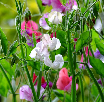 ベランダ庭話 5月の花たちその2:スイートピー、デルフィニウム、ゲラニウム、オダマキなど